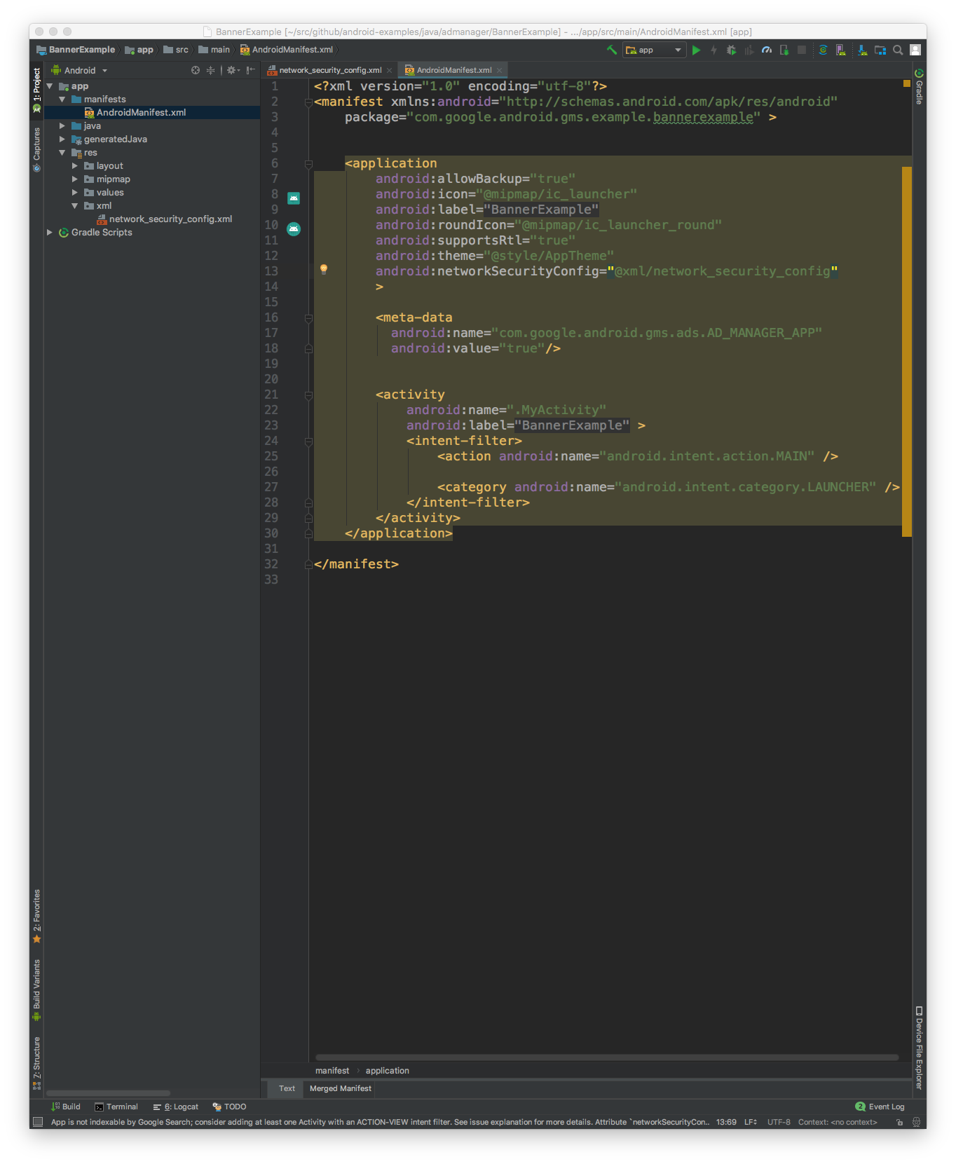 इसके बाद, नेटवर्क सुरक्षा कॉन्फ़िगरेशन का इस्तेमाल करने के लिए, AndroidManifest.xml फ़ाइल को अपडेट करें.