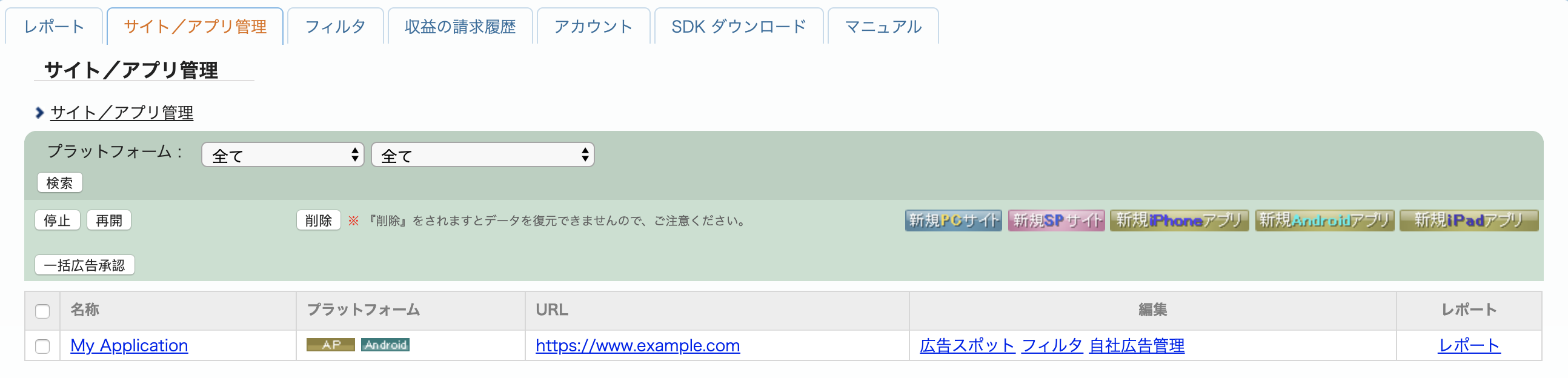 Aby utworzyć nowe miejsce reklamowe, wybierz aplikację na karcie サイト/アプリ管理 (Site/Application Management).