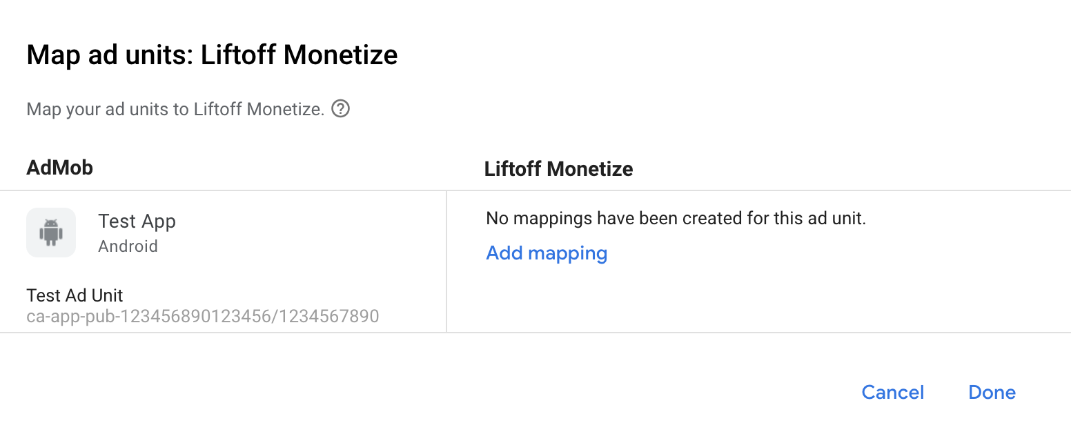 Jeśli masz już mapowanie dla Liftoff Monetize, możesz je wybrać. W przeciwnym razie kliknij Dodaj mapowanie.