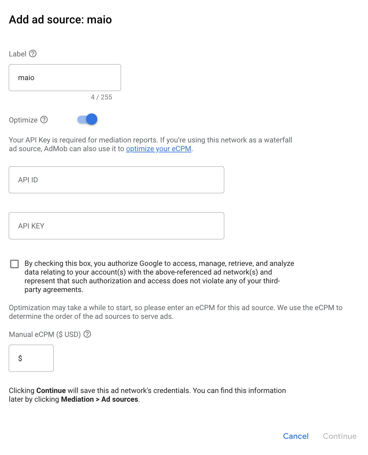 [maio] を選択し、[最適化] スイッチを有効にします。前のセクションで取得した API ID と API キーを入力して、maio の広告のソース最適化を設定します。次に、maio の eCPM 値を入力し、[続行] をクリックします。