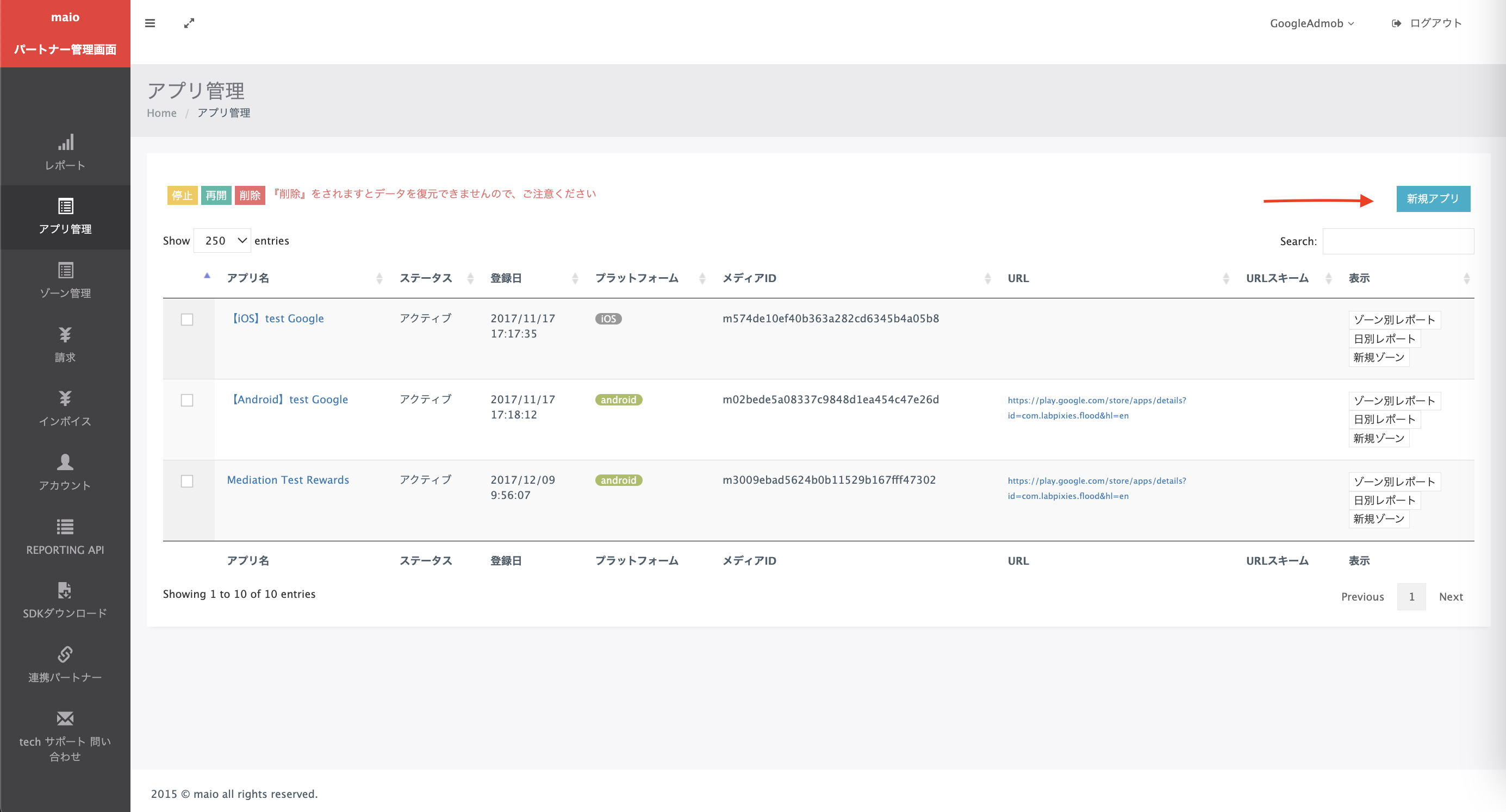 まず、maio アカウントに登録するか、ログインします。左側のサイドバーにある [アプリケーションの管理] ボタンをクリックし、[新しいアプリ] をクリックします。