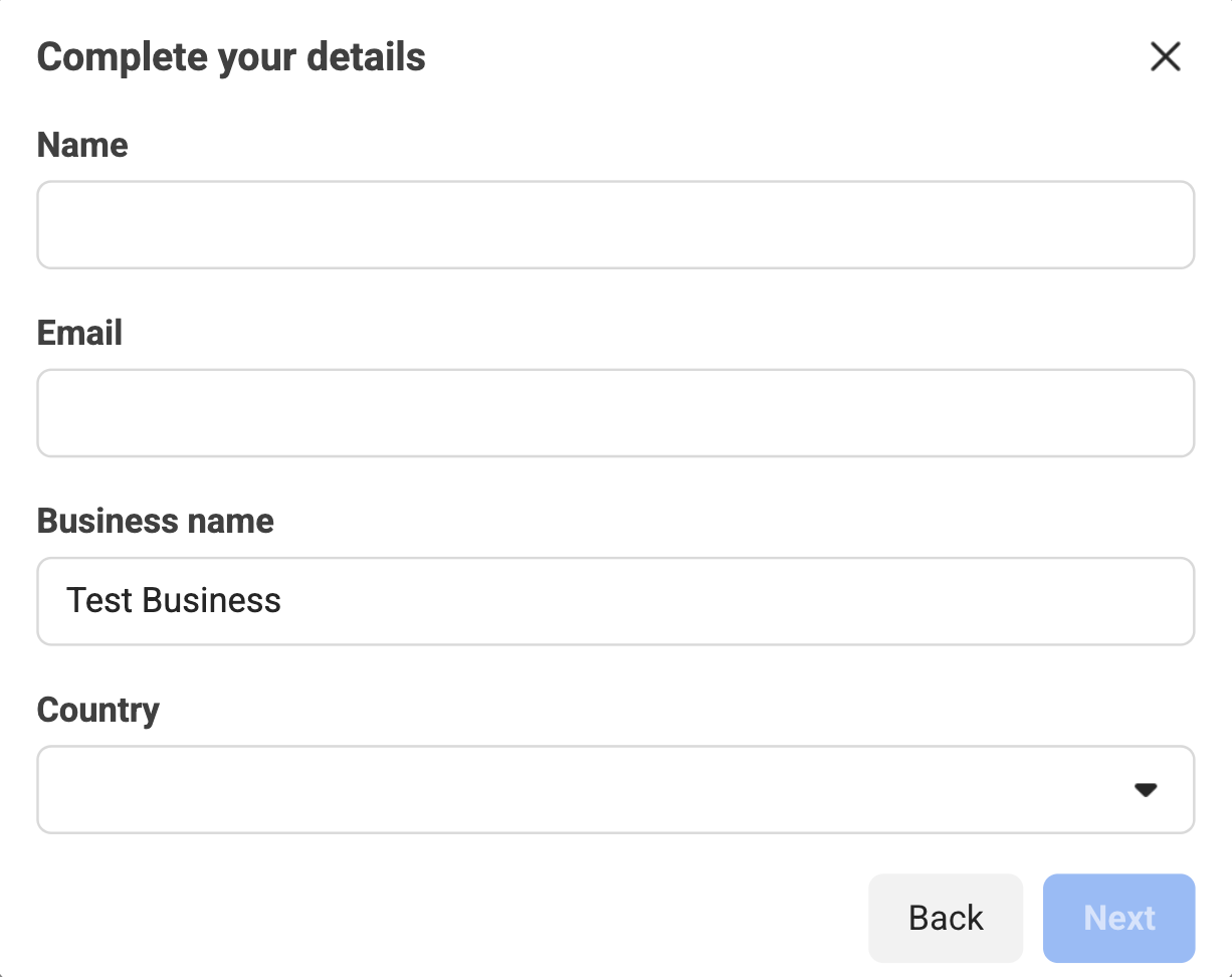 Điền thông tin chi tiết về doanh nghiệp của bạn vào các trường bắt buộc rồi nhấp vào Tiếp theo.