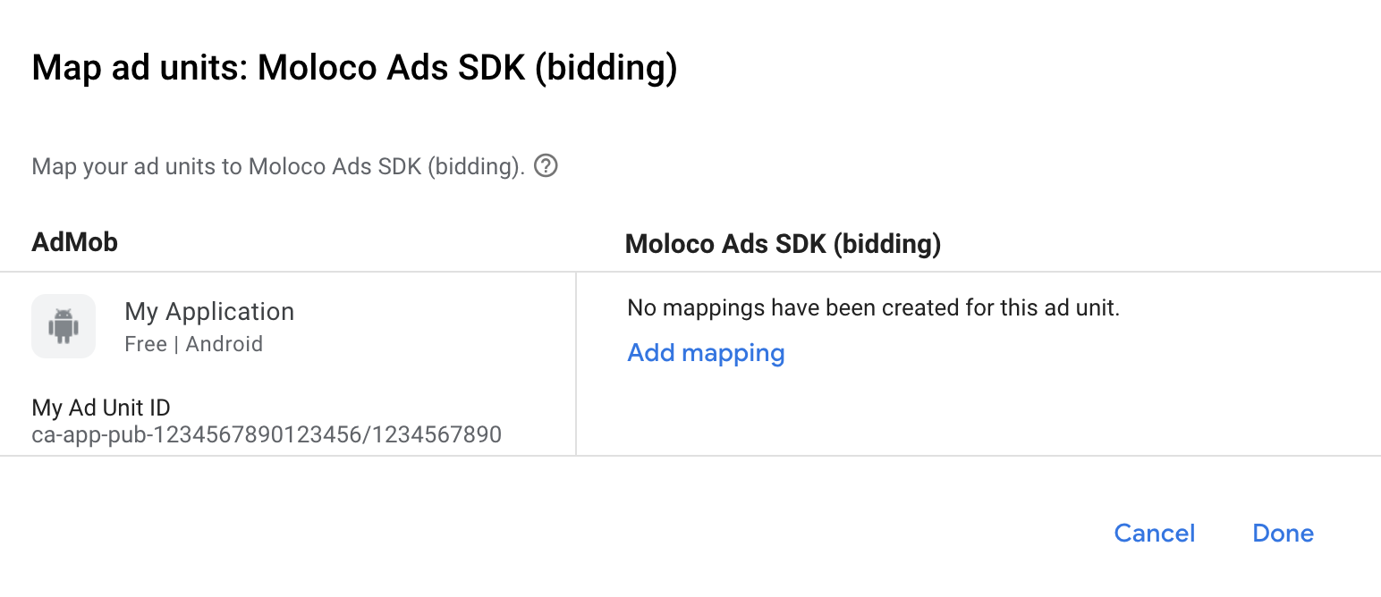 Jeśli masz już mapowanie pakietu Moloco Ads SDK, możesz je wybrać. W przeciwnym razie kliknij Dodaj mapowanie.