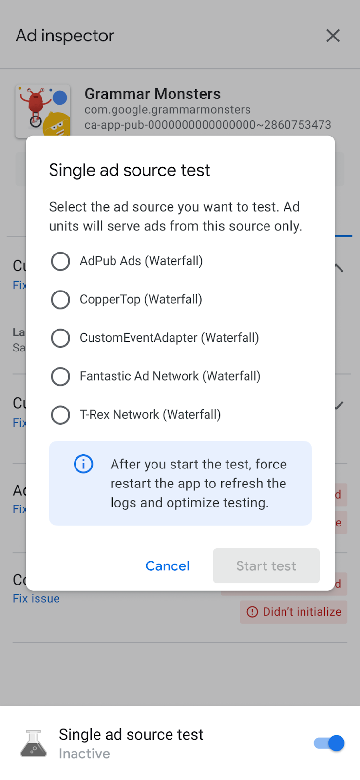 Uygulamanızı yeniden başlattıktan sonra tüm reklam birimi yerleşimleri, seçilen reklam kaynağından bir reklam göstermeye çalışır. Tek reklam kaynağı testi etkin olduğunda reklam inceleyiciyi başlatmak, etkin test reklam kaynağını gösterir: