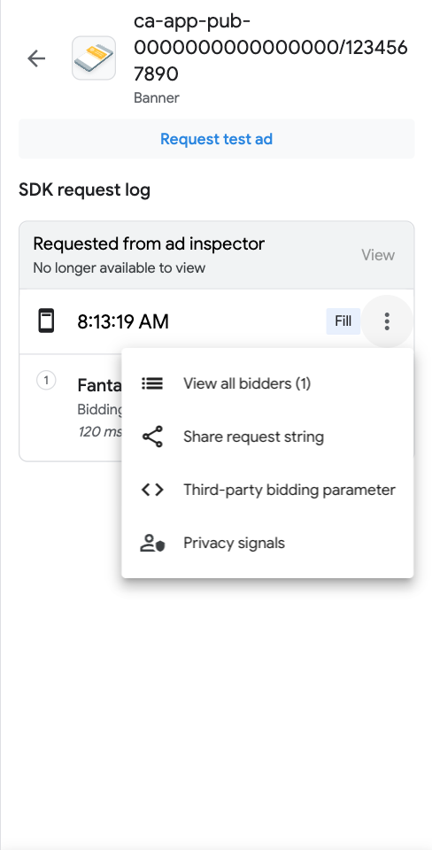 在 SDK 请求日志中,您可以看到广告请求中调用的出价广告来源。 如需查看出价竞价中每个广告来源的详细信息,请点按 more_vert ,然后点击查看所有出价方: