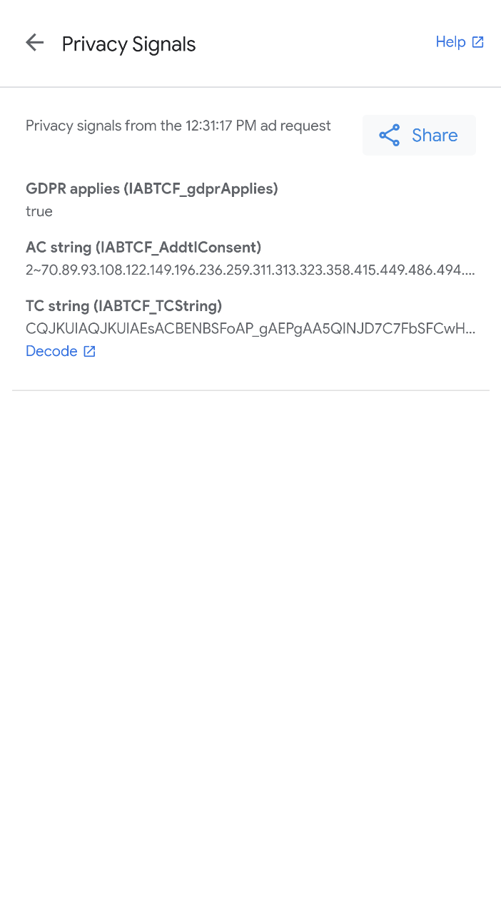ในส่วนของ การผสานรวมผู้เผยแพร่โฆษณากับ TCF ของ IAB Europe ให้ใช้เครื่องมือตรวจสอบโฆษณาเพื่อดูสัญญาณความเป็นส่วนตัวต่อไปนี้ในคำขอโฆษณา