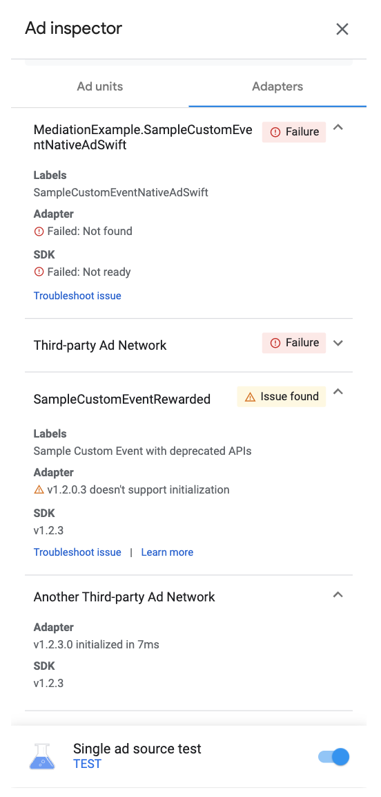 आपके पास, कॉन्फ़िगर किए गए विज्ञापन सोर्स से जुड़े सभी अडैप्टर की सूची देखने का विकल्प होता है. सूची देखने के लिए, यह तरीका अपनाएं: