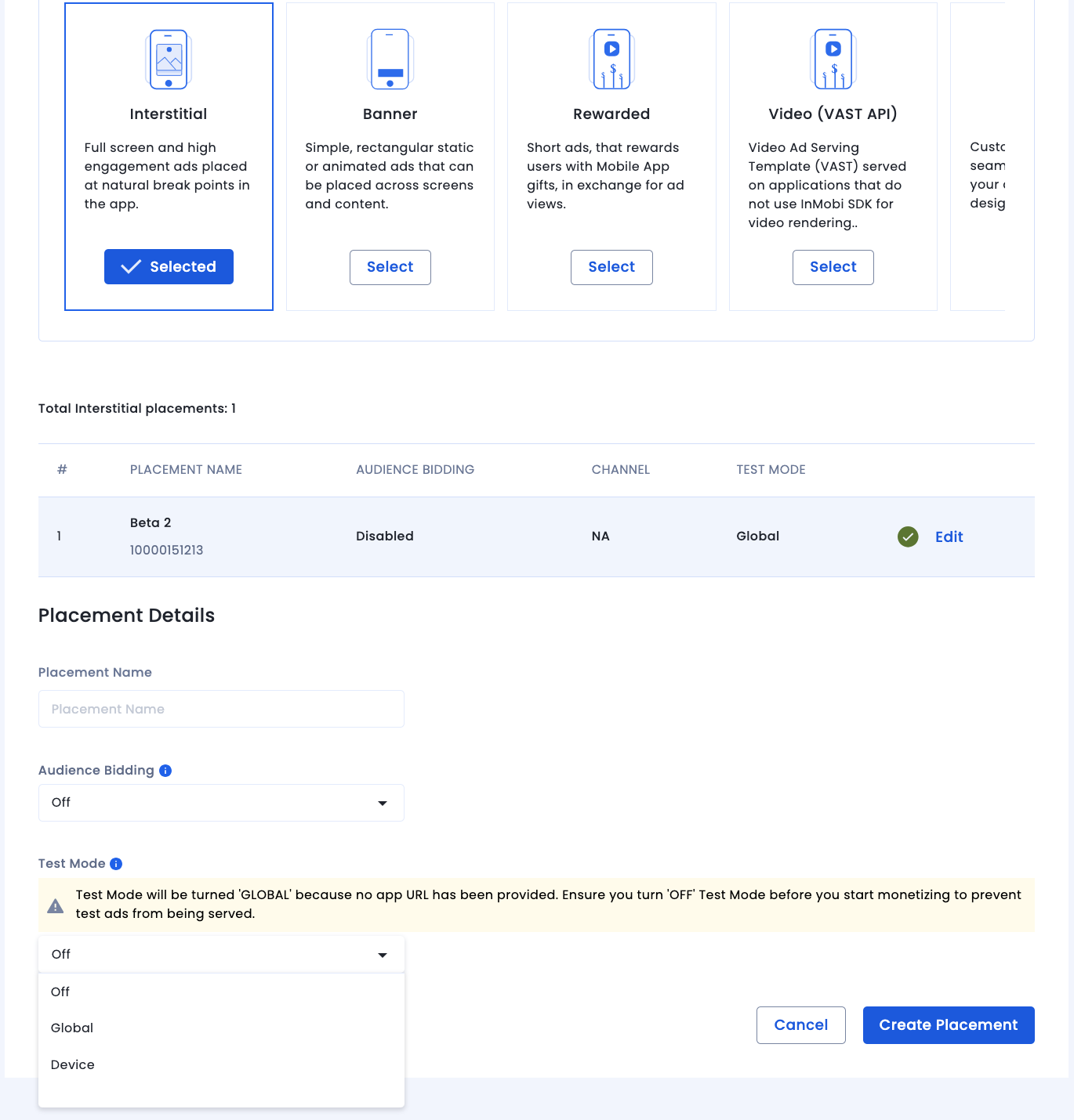 Để xác minh rằng bạn đang nhận được quảng cáo thử nghiệm từ InMobi, hãy bật thử nghiệm riêng một nguồn quảng cáo trong công cụ kiểm tra quảng cáo bằng (các) nguồn quảng cáo InMobi (Đặt giá thầu) và InMobi(Dạng thác nước).