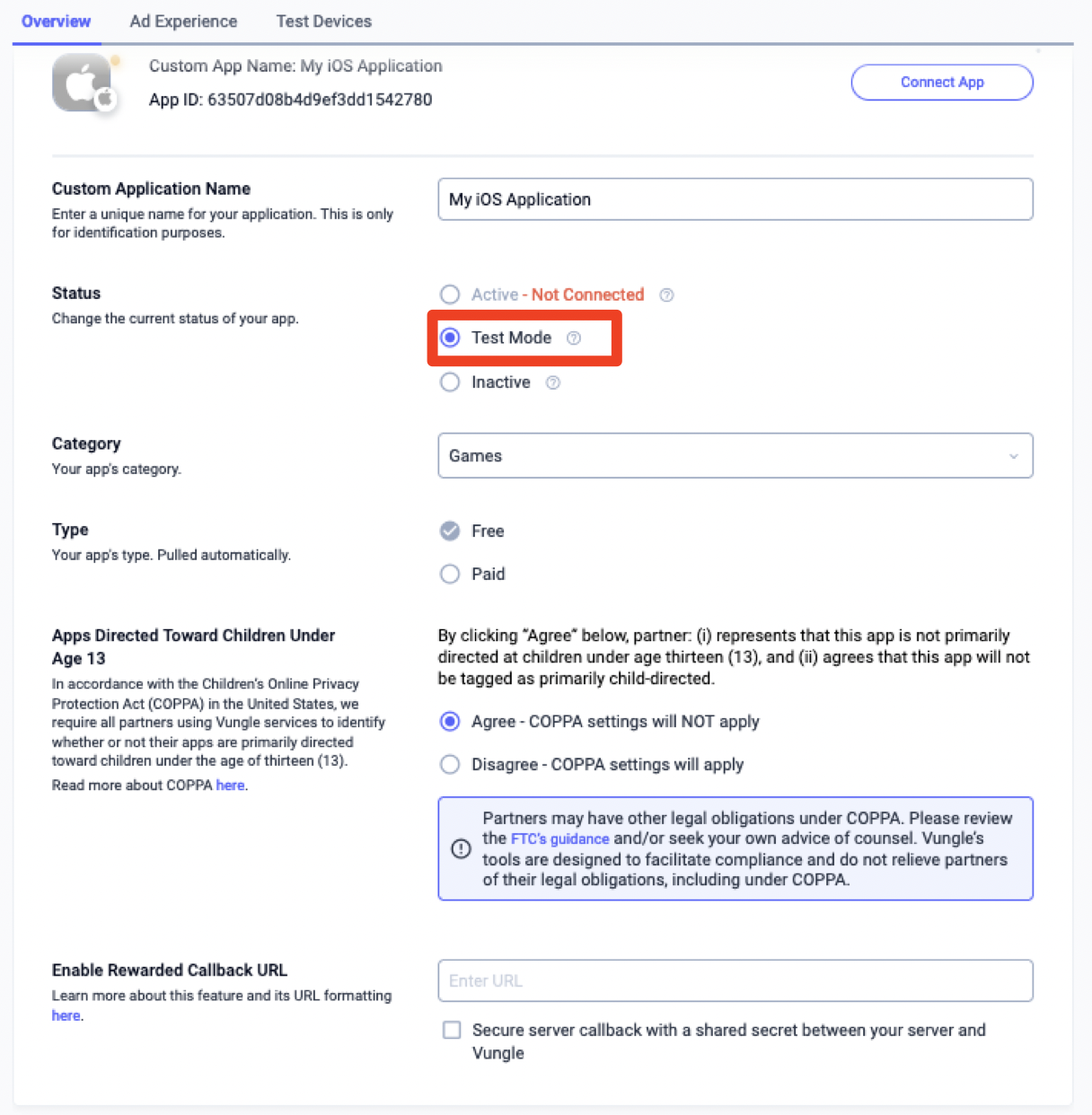 アプリの [プレースメント参照 ID] セクションで、テスト広告を有効にするアプリを選択します。[ステータス] セクションで [テストモード] を [テスト広告のみを表示] に設定すると、テスト広告を有効にできます。