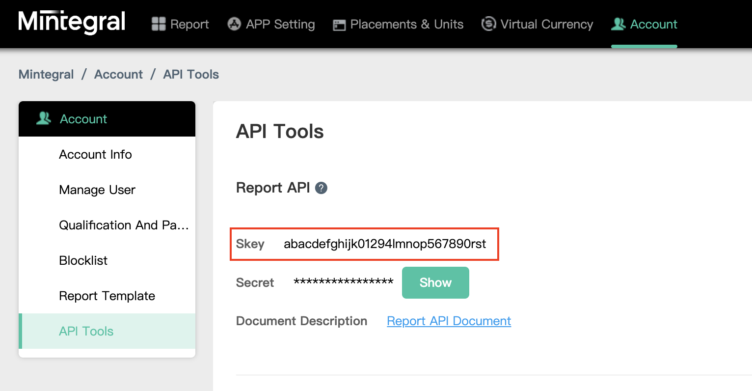 You will need your Mintegral Reporting API Key for setting up your AdMob ad unit ID. Navigate to Account > API Tools. Take note of your Skey and Secret.