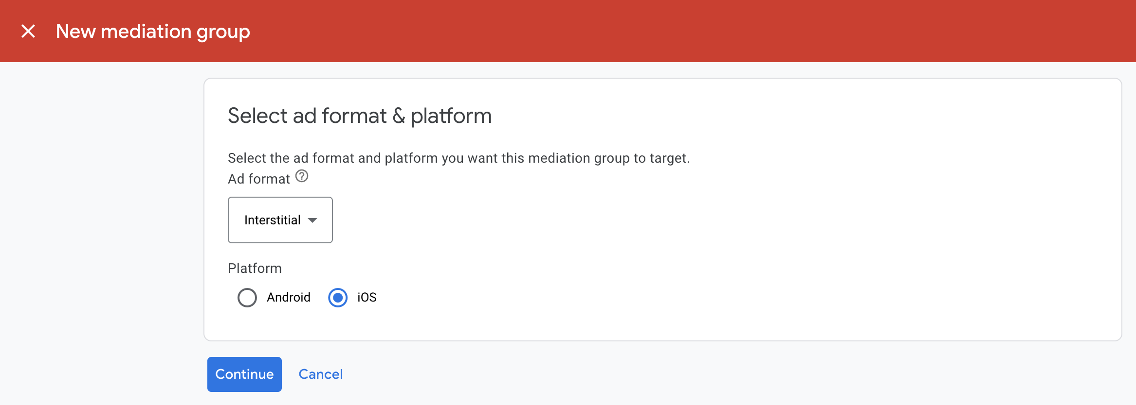 広告フォーマットとプラットフォームを入力し、[続行] をクリックします。