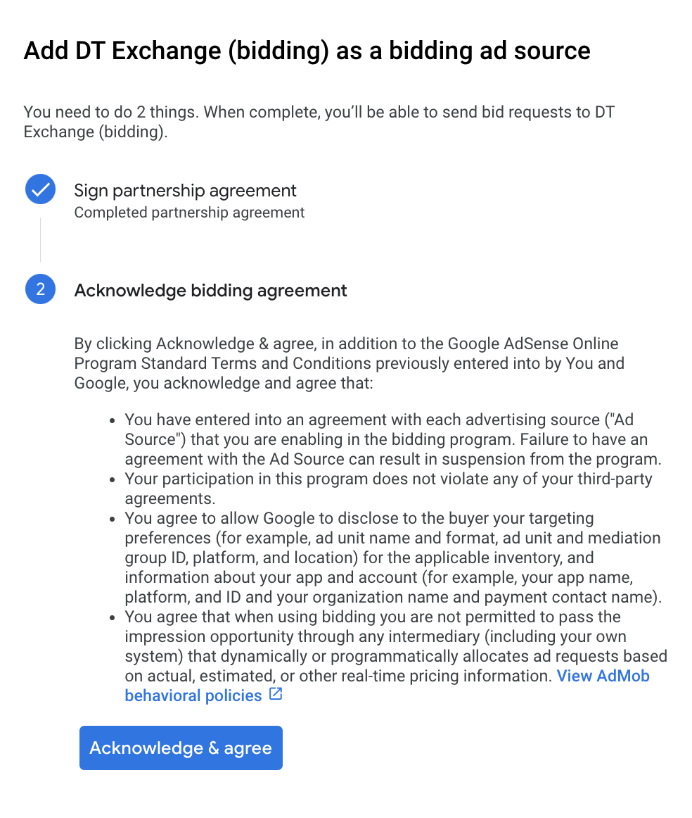 คลิกวิธีลงนามในข้อตกลงสำหรับพาร์ทเนอร์และ ตั้งค่าการเป็นพาร์ทเนอร์การเสนอราคากับ DT Exchange