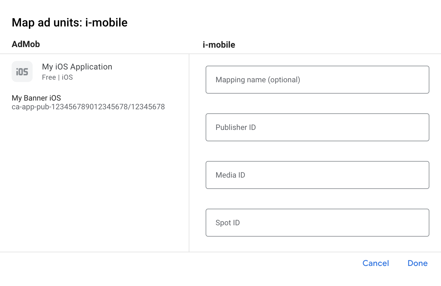 パブリッシャーआईडी (पब्लिशर आईडी), メディアआईडी (मीडिया आईडी), और スポットआईडी (स्पॉट आईडी) को नोट करें. आपको इन पैरामीटर की ज़रूरत AdMob के यूज़र इंटरफ़ेस में मीडिएशन के लिए i-mobile को कॉन्फ़िगर करते समय होगी.