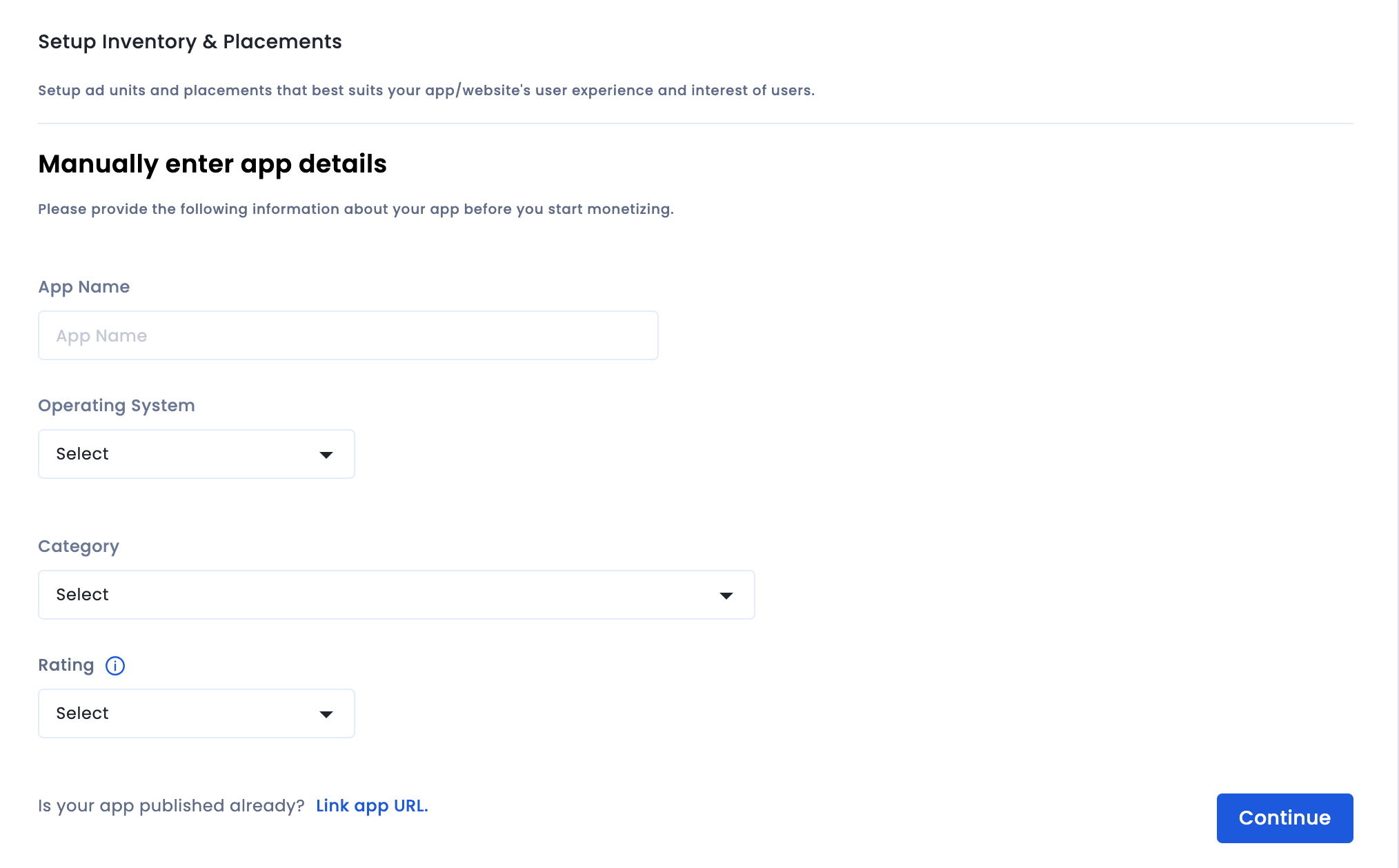 Uygulamanız yayınlanmadıysa Manuel olarak bağla'yı tıklayın ve gerekli ayrıntıları girin. Devam'ı tıklayın.