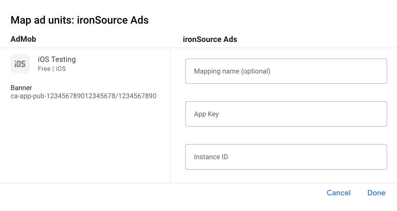 如果您已为 ironSource Ads 创建映射,可以选择该映射。否则,请点击添加映射。