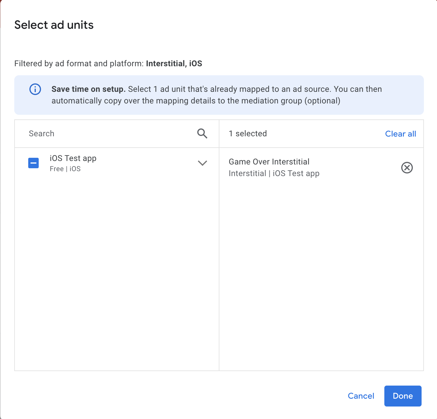 इस मीडिएशन ग्रुप को अपनी मौजूदा AdMob विज्ञापन यूनिट में से एक या इससे ज़्यादा विज्ञापन यूनिट से जोड़ें. इसके बाद, हो गया पर क्लिक करें.