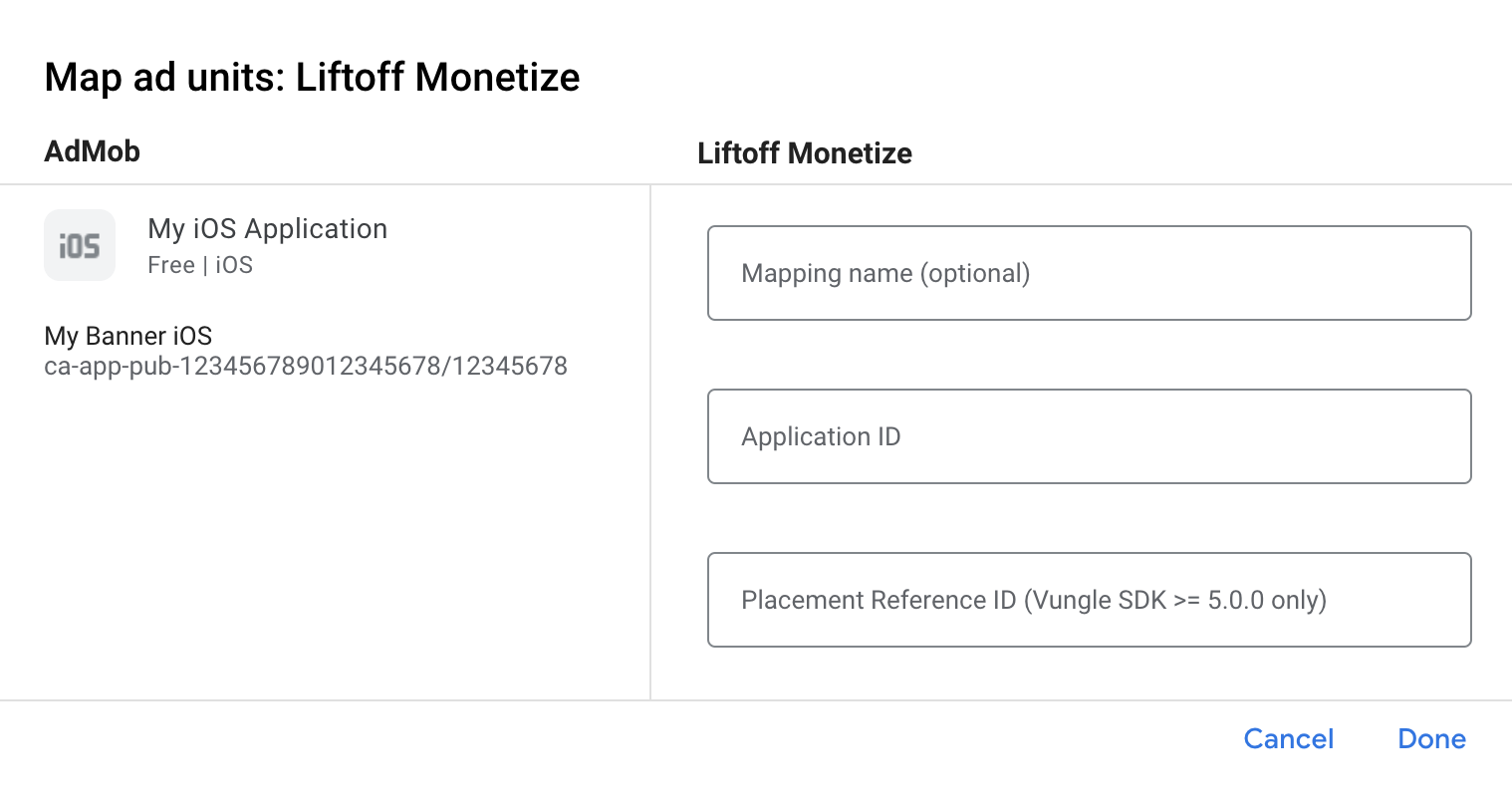 Passaggio 2: configura la domanda di Liftoff Monetize nell'interfaccia utente di AdMob