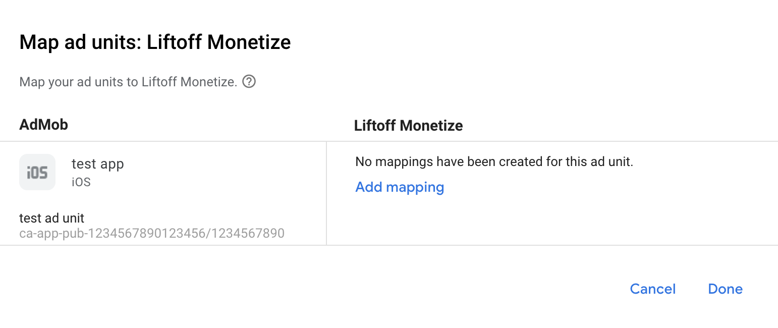 Se você já tiver um mapeamento para a Liftoff Monetize, selecione-o. Caso contrário, clique em Adicionar mapeamento.