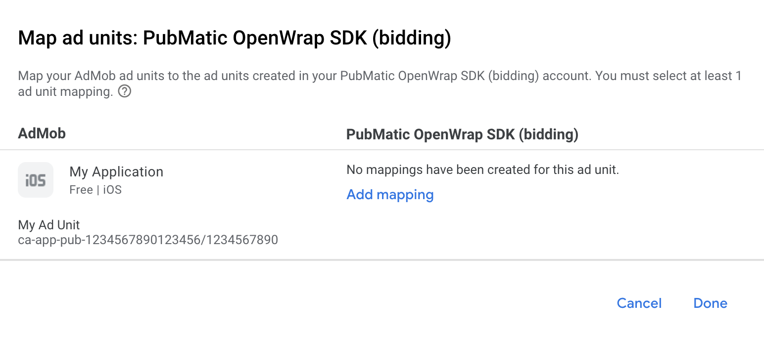 PubMatic OpenWrap SDK のマッピングがすでに存在する場合は、それを選択できます。それ以外の場合は、[マッピングを追加] をクリックします。