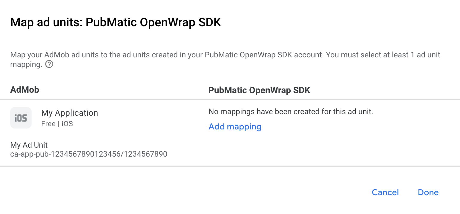 Se você já tiver um mapeamento para o SDK OpenWrap da PubMatic, selecione-o. Caso contrário, clique em Adicionar mapeamento.
