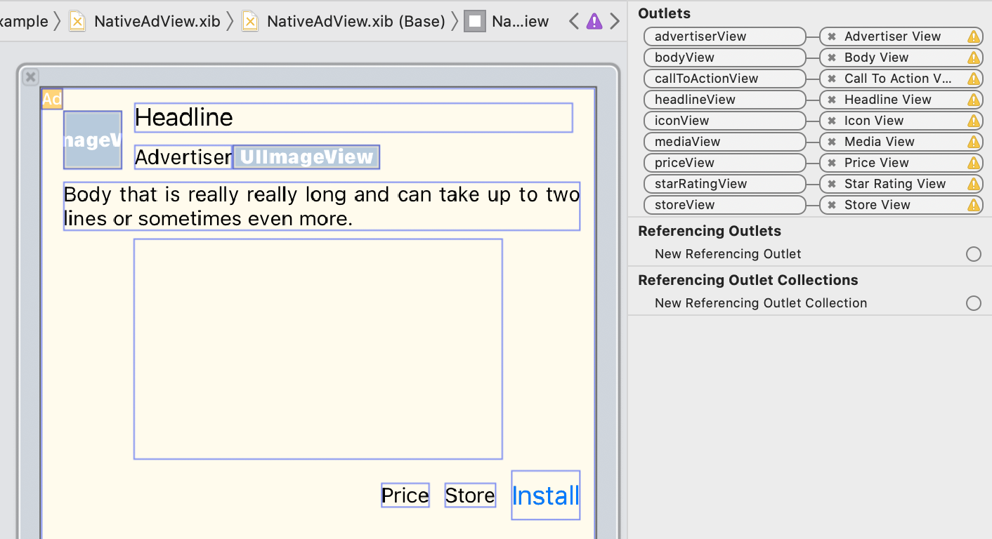 في لوحة المنافذ، تم ربط المنافذ في GADNativeAdView بالعناصر UIViews التي تم تصميمها في Interface Builder. يتيح ذلك لحزمة تطوير البرامج (SDK) معرفة UIView الذي يعرض مادة العرض.