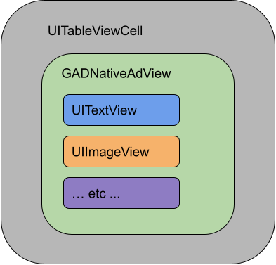 Ein einzelnes GADNativeAdView kann beispielsweise eine einzelne Instanz eines GADNativeAd darstellen. Jedes der UIView-Objekte, die zum Anzeigen der Assets der Anzeige verwendet werden, sollte eine untergeordnete Ansicht des GADNativeAdView-Objekts sein.