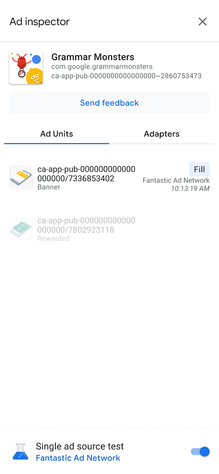 Depois de reiniciar o app, todas as posições de bloco de anúncios tentam mostrar um anúncio da origem de anúncios selecionada. Ao iniciar o Ad Inspector quando um teste com uma única origem de anúncios está ativo, a origem de anúncios desse teste é mostrada: