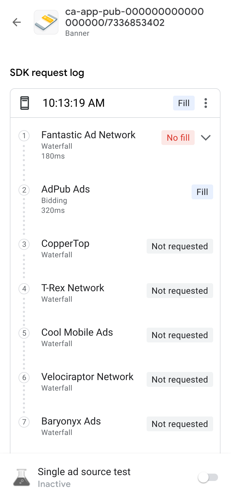 Tippen Sie auf dem Tab Anzeigenblöcke auf einen Anzeigenblock, um das SDK-Anfrageprotokoll aufzurufen. Im SDK-Anfrageprotokoll finden Sie Details zur Vermittlungsabfolge ab der Anzeigenanfrage, z. B. wann die Anzeige ausgeliefert wurde, welche Anzeigenquelle sie ausgeliefert hat oder ob die Vermittlungsabfolge ohne Auslieferung beendet wurde.