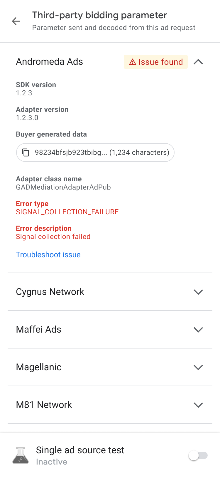 Si vous rencontrez un problème de type Aucune annonce renvoyée, copiez les données générées par l'acheteur et partagez-les avec les sources d'annonces pour obtenir de l'aide.