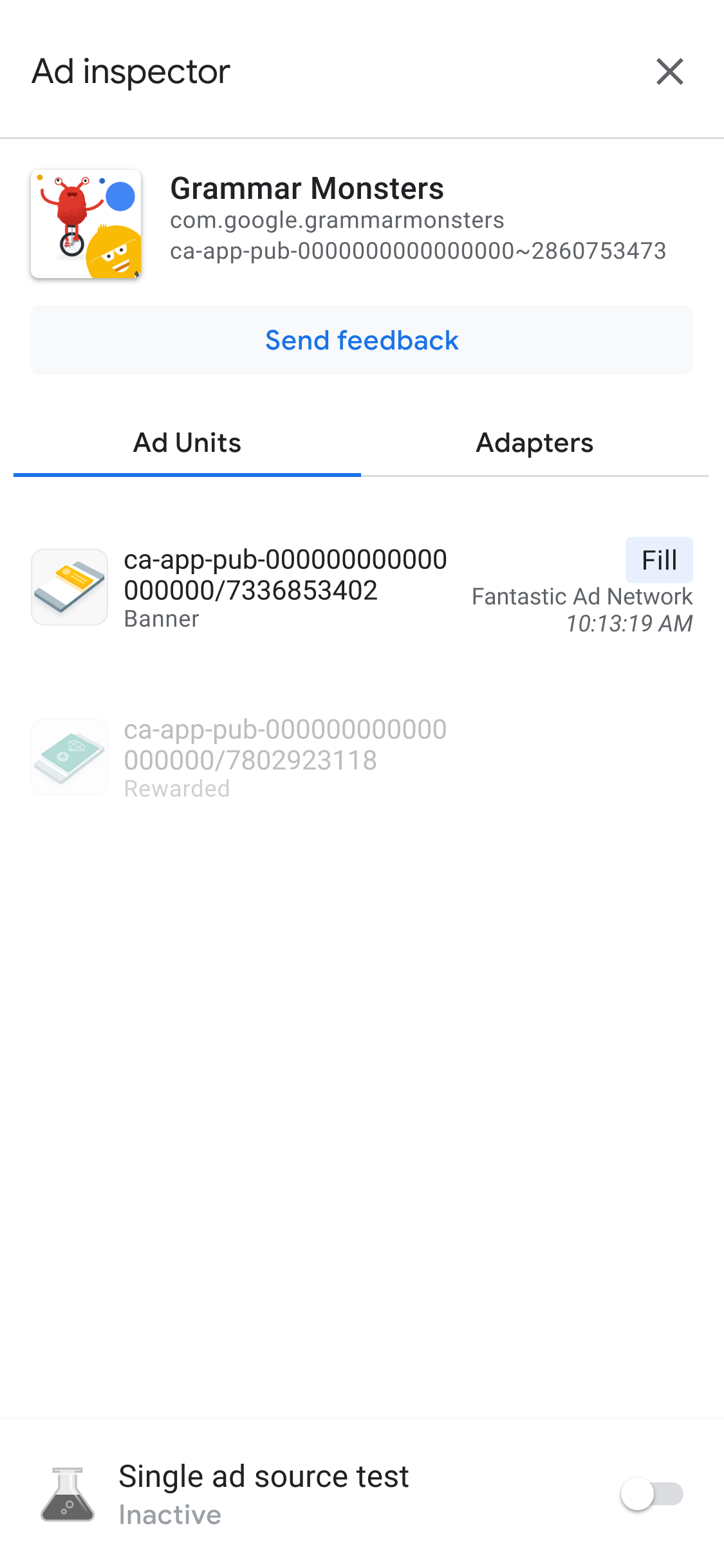 このページには、AdMob アプリ ID に関連付けられている AdMob 管理画面の広告ユニットのリストが表示されます。セッション中にアプリが他の広告ユニットから広告をリクエストすると、広告インスペクタにこれらの広告ユニットが表示されます。