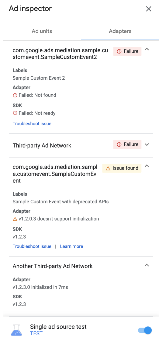 如果找不到适配器或未能初始化,请参阅排查使用广告检查器发现的问题