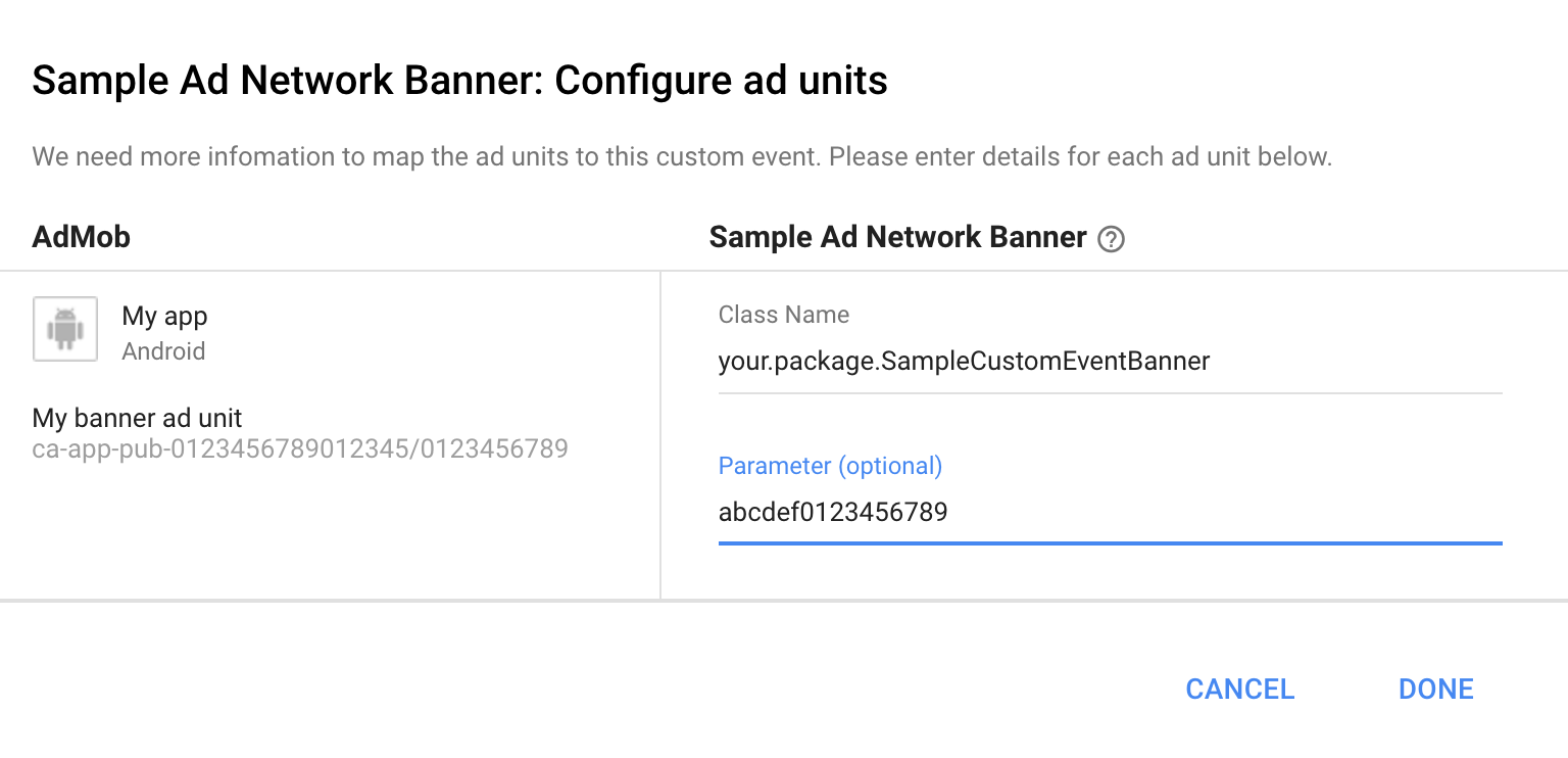 | 类名称 (Android) | 对于 Android,请确保您为 Class Name 指定的值是 Android 的完全限定 (fully qualified) 类名称(如 com.google.ads.mediation.sample.customevent.SampleCustomEvent)。 |