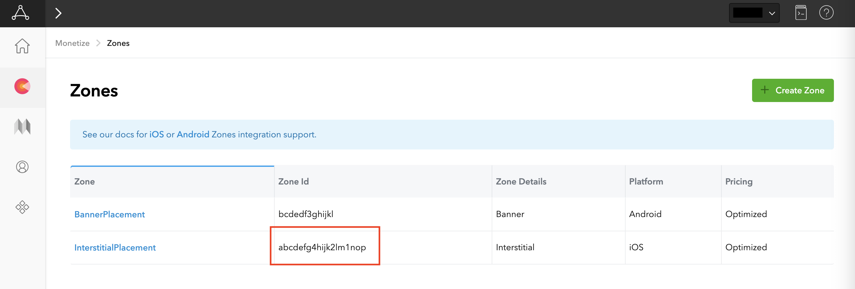 Wählen Sie in der AppLovin-Benutzeroberfläche unter Monetization (Monetarisierung) die Option Zones (Zonen) aus, um die registrierten Zonen-IDs aufzurufen. Wenn Sie die erforderlichen Zonen für Ihre App bereits erstellt haben, fahren Sie mit Schritt 2 fort. Wenn Sie eine neue Zonen-ID erstellen möchten, klicken Sie auf Zone erstellen.