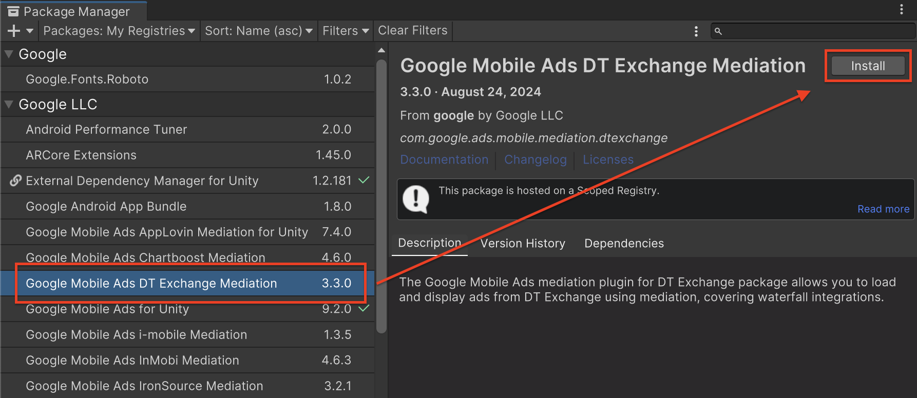 Chọn gói Google Mobile Ads DTExchange Mediation rồi nhấp vào Install (Cài đặt).