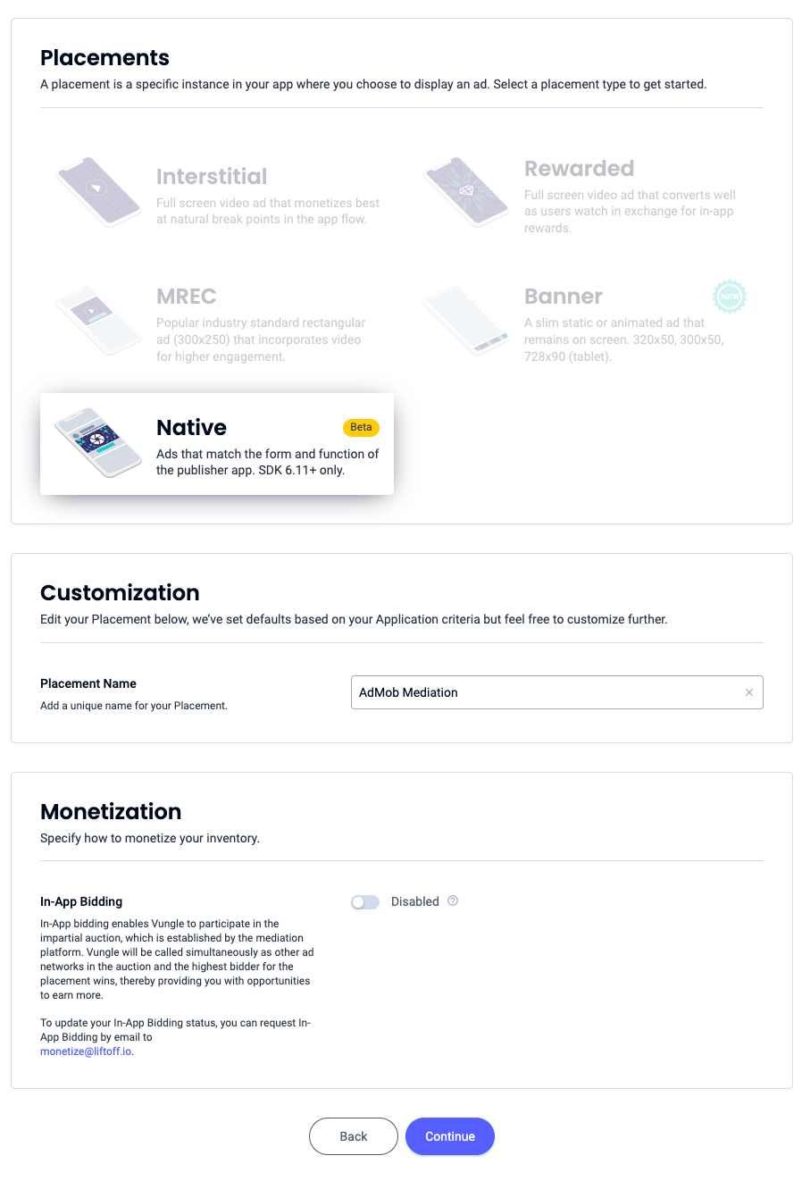 选择原生,输入展示位置名称,然后填写表单的其余部分。[仅限出价] 在创收下,将应用内出价开关切换为启用。点击页面底部的继续按钮,以创建展示位置。