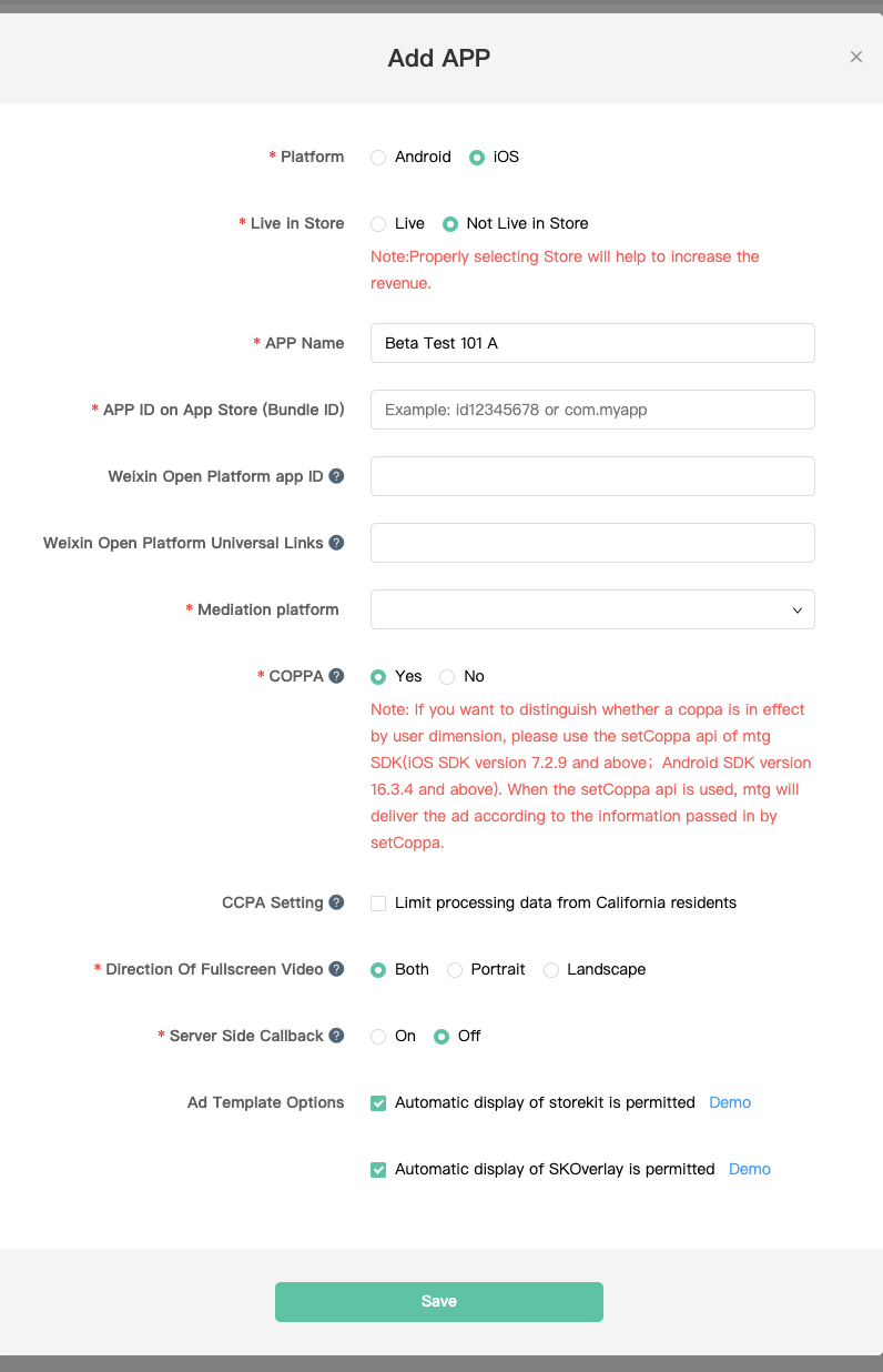 Mintegral에서는 배너 광고, 전면 광고, 보상형 광고, 네이티브 광고 형식의 Mintegral 테스트 광고를 가져오기 위해 Mintegral 테스트 ID 페이지에 제공된 앱 키, 앱 ID, 게재위치 ID, 광고 단위 ID를 사용하는 것을 권장합니다.