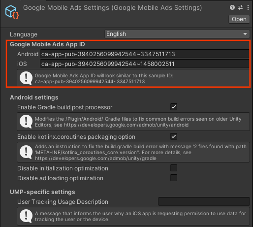 Unity एडिटर में, मेन्यू से ऐसेट > Google Mobile Ads > सेटिंग चुनें.
