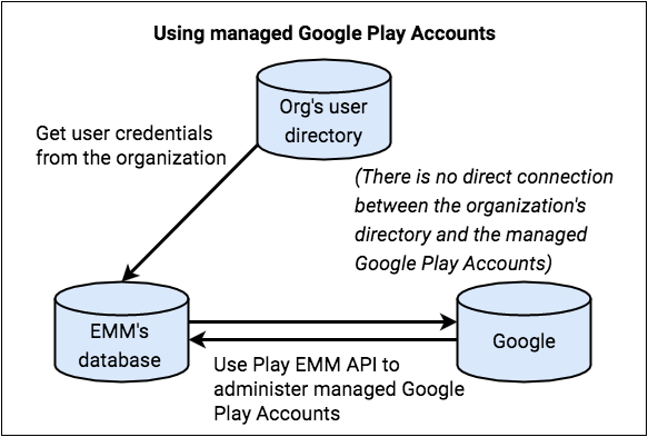 मैनेज किए जा रहे Google Play खाते, एंटरप्राइज़ को अपने एंटरप्राइज़ मोबिलिटी मैनेजमेंट (EMM) सलूशन प्रोवाइडर की मदद से, उपयोगकर्ता या डिवाइस खाते अपने-आप बनाने का पारदर्शी तरीका उपलब्ध कराते हैं. इन खातों से सिर्फ़ 'कारोबार के लिए Google Play' को ऐक्सेस किया जा सकता है.