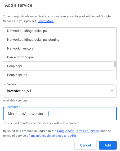 Pour utiliser le service Merchant API dans Apps Script, procédez comme suit :