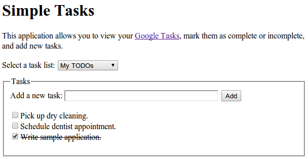 Aplikasi web contoh Simple Tasks menunjukkan cara menggunakan layanan Tasks untuk operasi baca dan tulis. Anda dapat melihat kode sumber lengkap di repositori GitHub kami.