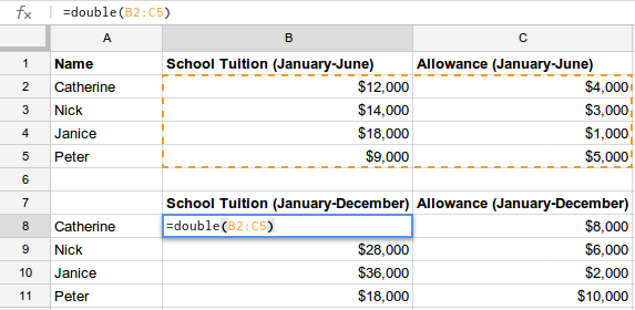 כך תוכלו להשתמש בפונקציה DOUBLE רק פעם אחת, אבל היא תחשב מספר גדול של תאים בבת אחת, כמו שמוצג בצילום המסך הבא. אפשר להשיג את אותה התוצאה באמצעות הצהרות if מקוננות במקום קריאה ל-map.