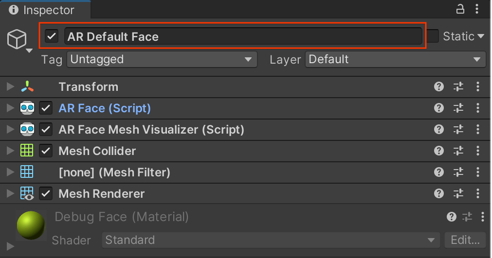 ARFaceManager. In the Hierarchy tab, use + > XR > AR Default Face to create a new face object. This object is temporary and can be deleted once you create the Face Prefab.