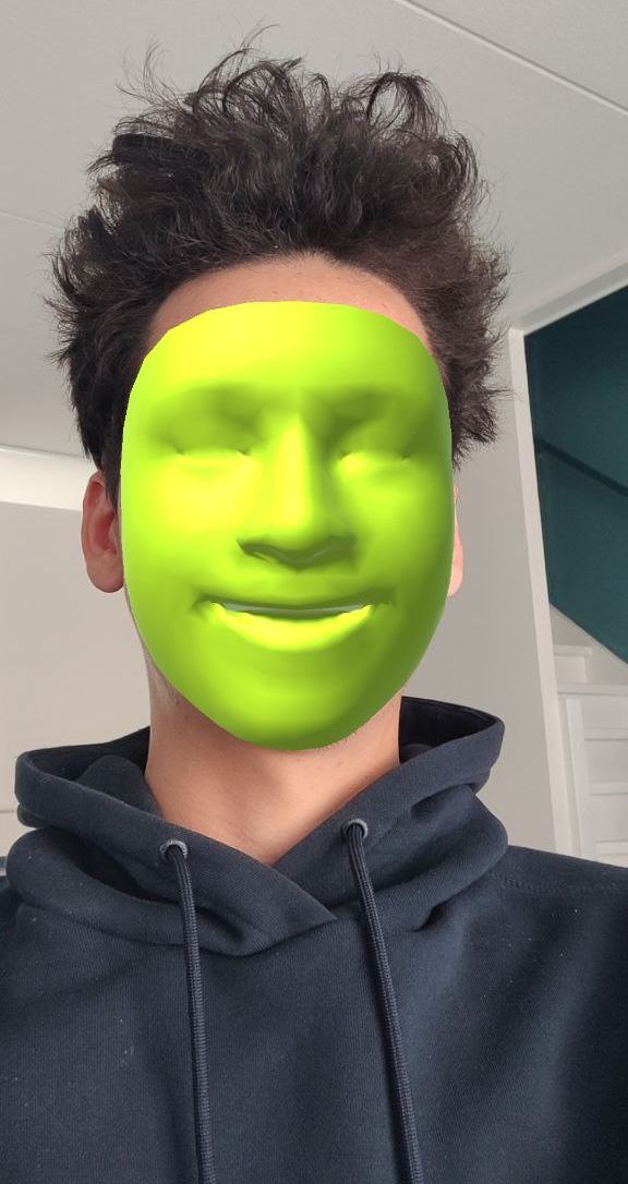 Para visualizar la malla de la cara, adjunta un ARFaceMeshVisualizer al Face Prefab. ARFaceMeshVisualizer generará un Mesh que corresponderá al rostro detectado y lo establecerá como la malla en los MeshFilter y MeshCollider adjuntos. Usa un MeshRenderer para establecer el Material que se usa para renderizar el rostro.