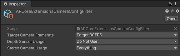 If your app doesn’t require Depth, you can prevent ARCore from using the depth sensor. On devices that have a supported depth sensor, ARCore ARCore prioritizes camera configs that use the depth sensor. To filter out all camera configs that use the depth sensor, make sure that Depth Sensor Usage is set to Do Not Use.