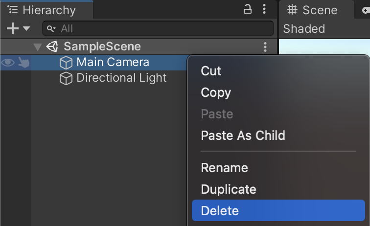 Before adding the new game objects, delete the default Main Camera. It will be replaced by a new AR Camera in the XR Origin.
