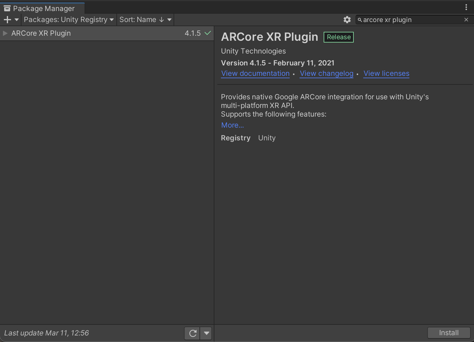 The ARCore XR Plugin package lets you build augmented reality apps for Android devices. Follow these steps to install it in your Unity project if your application targets Android devices. Use the same version as the AR Foundation package to avoid any compatibility issues.