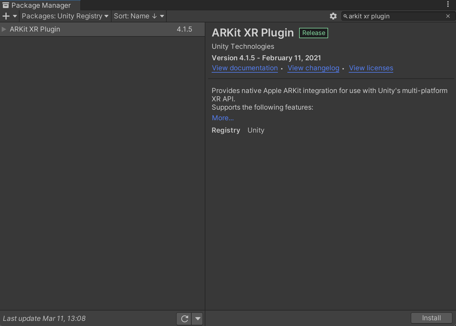 The ARKit XR Plugin allows you to build augmented reality apps for iOS devices. Follow these steps to install it in your Unity project if your application targets iOS devices. Use the same version as the AR Foundation package to avoid any compatibility issues.
