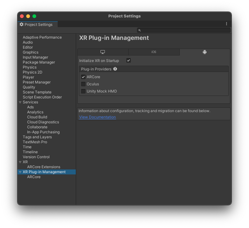 Navigate to Edit > Project Settings. In XR Plug-in Management, open the Android tab and enable ARCore.