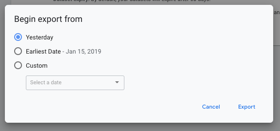 כדי לייצא נתונים מתאריך מוקדם יותר, אפשר למלא חוסרים (backfill) של נתונים היסטוריים. כדי לעשות את זה, יש לבצע את השלבים הבאים: