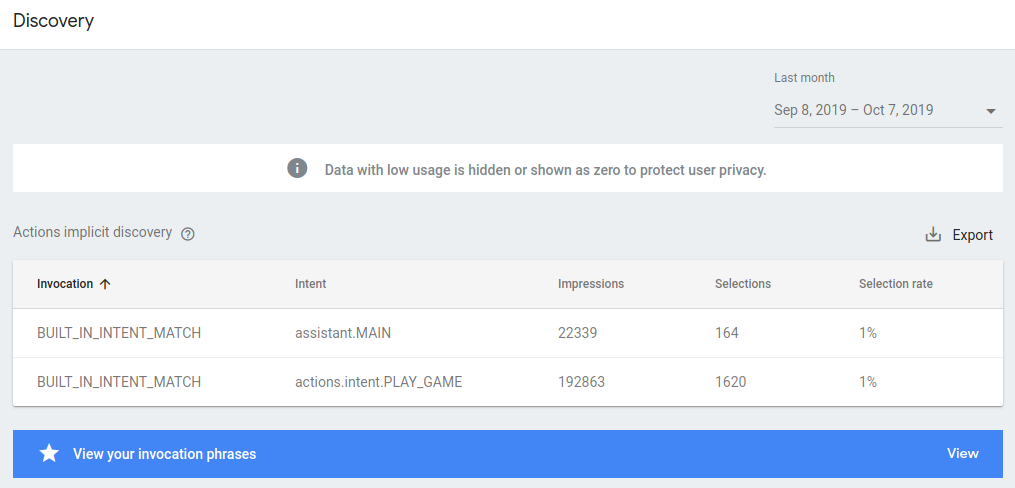 כשמשתמשים אומרים ביטוי שקשור לפעולה, לפעמים Google תמליץ למשתמש לנסות את הפעולה, גם אם הוא לא ציין במפורש את שם ההפעלה. בדף הגילוי מוצגת טבלה של הביטויים שהובילו לכך ש-Google המליצה על הפעולה שלכם. אלה העמודות בטבלה: